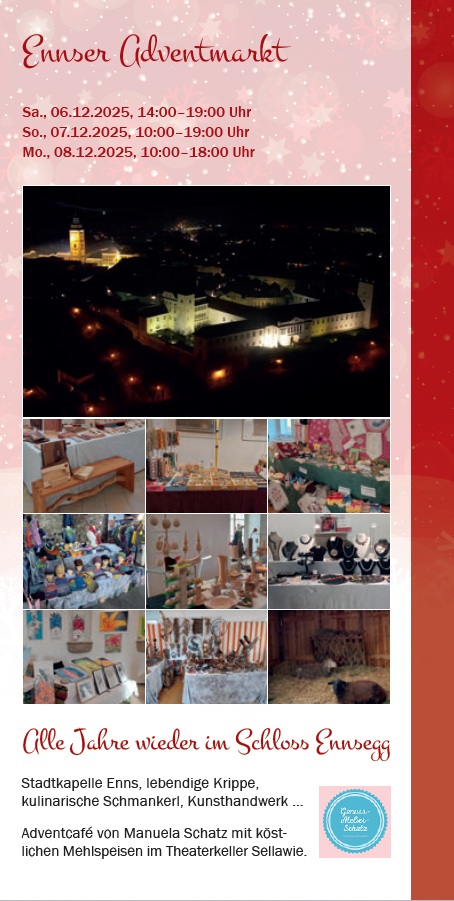 Wir sind heuer zum ersten Mal am Ennser Adventmarkt vom 6. – 8.Dezember 2025, Schloss Ennsegg! Hier können Sie alle unsere Editionen verkosten und natürlich auch gleich Mitnehmen!